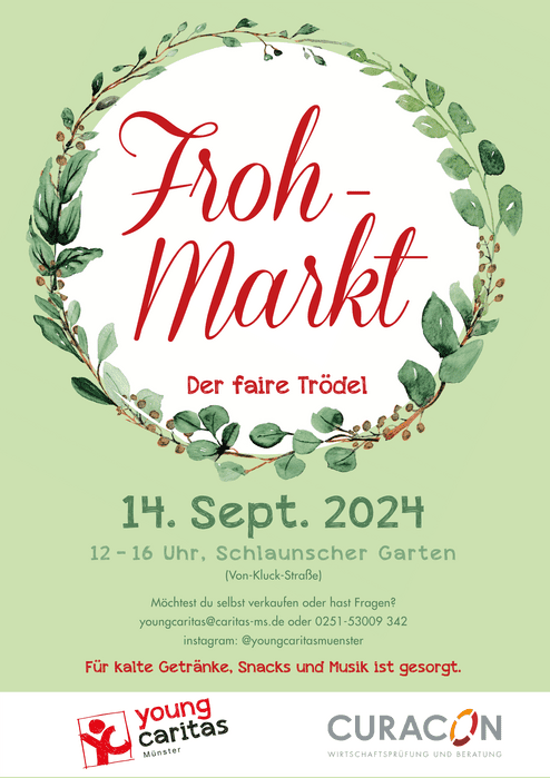 Im September fand wieder der Frohmarkt der youngcaritas statt. Bei bestem spätsommerlichen Wetter strömten viele Besucher:innen in den Garen der Caritas im Südviertel. An rund 25 Ständen konnte gefeilscht und gestöbert werden. Ob Kleidung, Möbel, Schmuck, Bücher, Spiele oder Hausrat – hier konnte jede:r fündig werden. Wer am Stand der youngcaritas-Engagierten zuschlagen wollte, konnte die Teile gegen Spende erwerben.